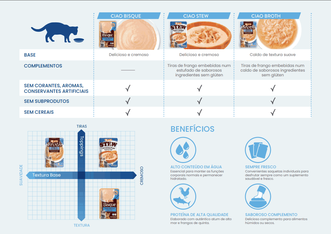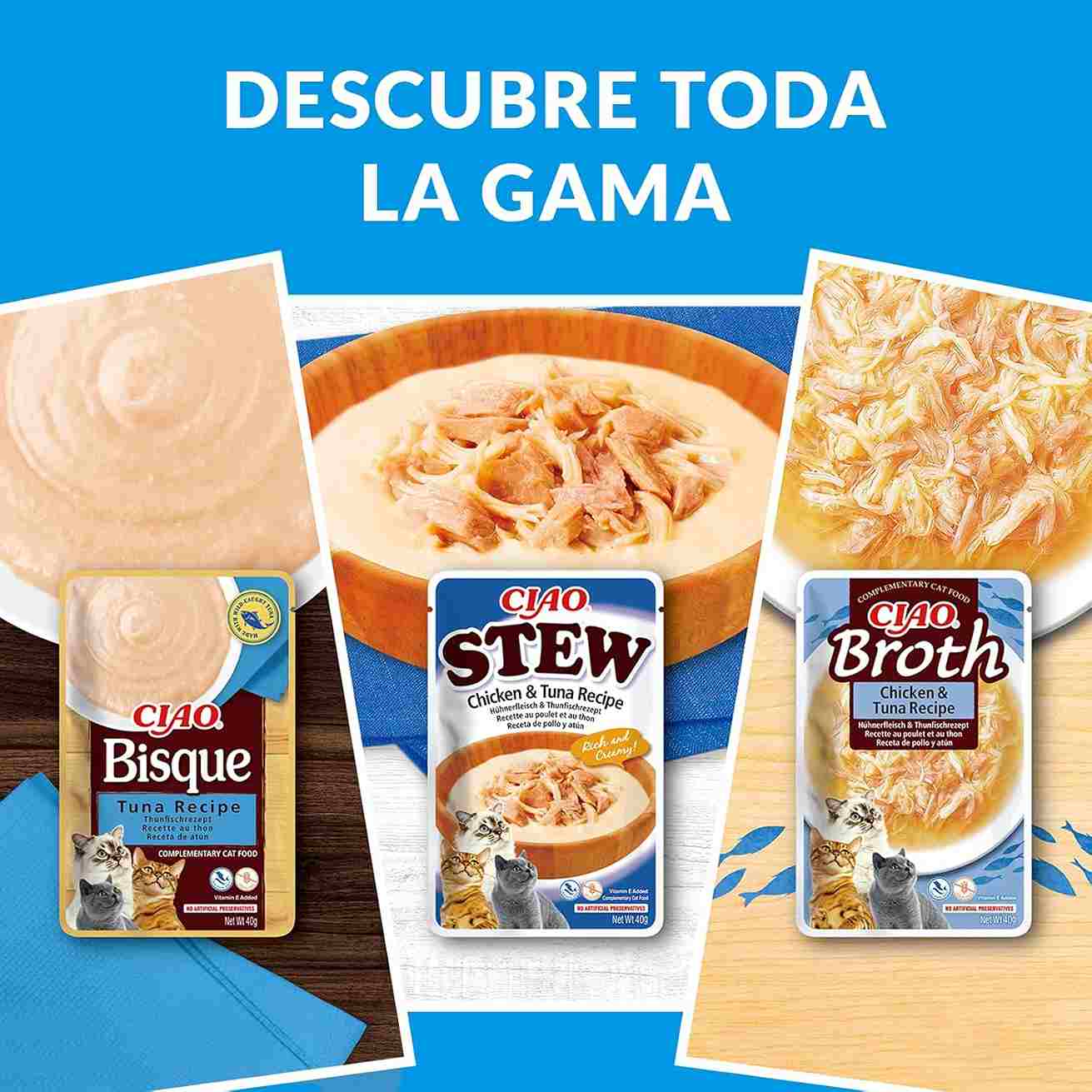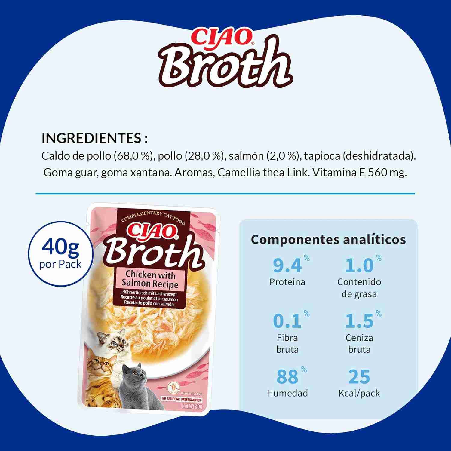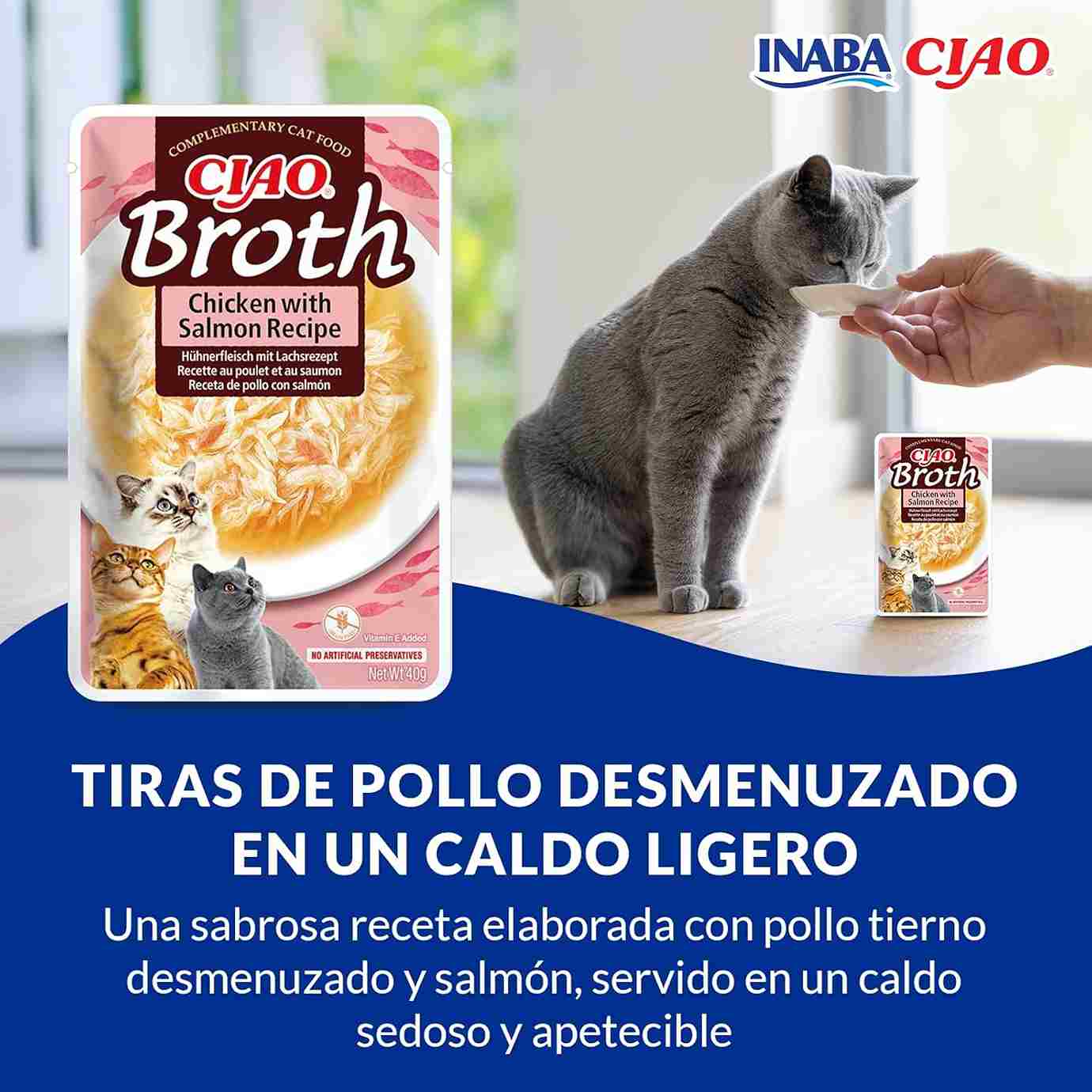 Na Inaba, acreditamos que o seu gato merece o melhor. Por isso, o primeiro ingrediente desta receita é um caldo de galinha feito com frango 100% natural. Para tornar tudo ainda mais suculento, adicionámos lascas reais de frango e pedaços de salmão que vão fazer o seu felino lamber os bigodes até não poder mais.