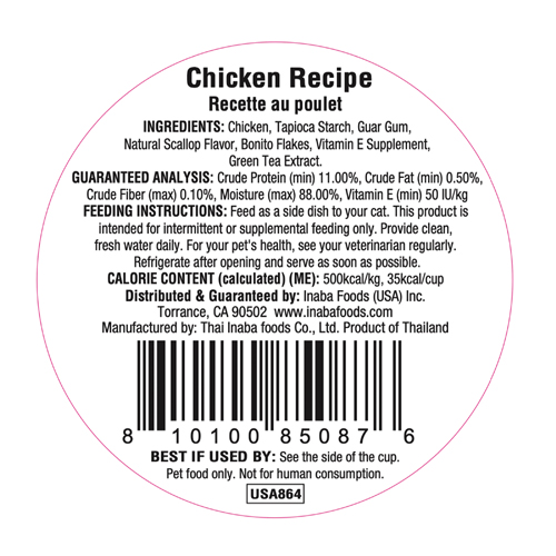 Frango, amido de tapioca, aromas naturais, goma guar, extrato de vieira, flocos de bonito, suplemento de vitamina E, extrato de chá verde.