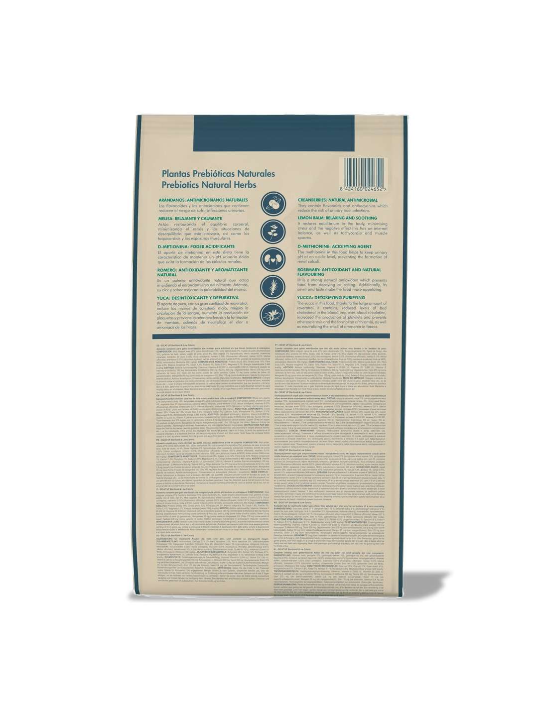 Milho inteiro, aves 27% (peru desidratado 15%, frango desidratado 9%, fígado de frango ultrahidrolisado 3%), proteína de milho, batata, óleo de frango, arroz 4%, fibra vegetal 3% (lignocelulose, efeito saciante), substâncias minerais, extratos de mandioca 0,02% (Yuca schidigera), alecrim 0,01% (Rosmarinus officinalis), erva-cidreira 0,01% (Melisa officinalis), mirtilos 0,01% (Vaccinium myrtillus), raiz de chicória (Inulina, fonte de FOS), paredes de levedura (fonte de MOS), aminoácidos (metionina 0,08 mg/kg).