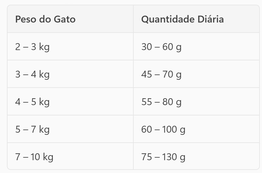 As quantidades indicadas são apenas valores de referência e devem ser ajustadas de acordo com o nível de actividade e necessidades individuais do gato.