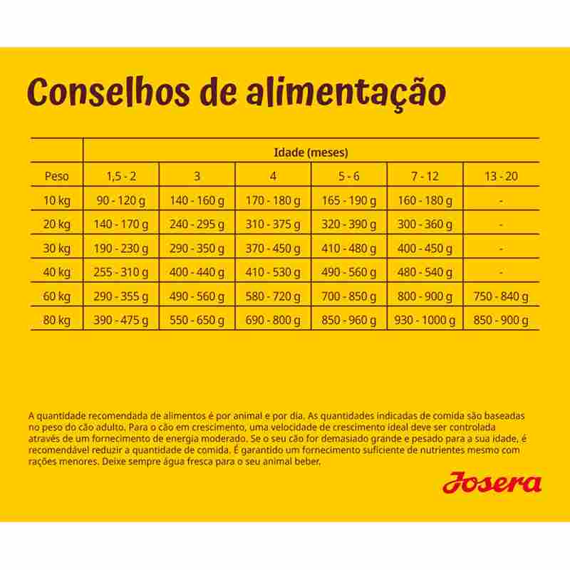 As quantidades recomendadas são por animal e por dia e baseiam-se no peso do cão adulto. Em cães em crescimento, promove-se um crescimento moderado através de ingestão energética equilibrada. Se o cão jovem estiver muito pesado para a idade, reduz-se a quantidade de alimento. O fornecimento adequado de nutrientes fica assegurado mesmo com porções menores. A quantidade deve ser reduzida se forem fornecidos snacks. O cão deve ter sempre água fresca disponível.