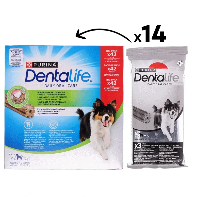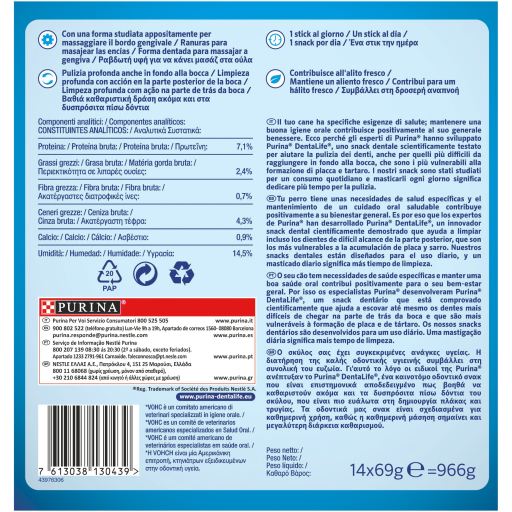 Com Purina® Dentalife®, isso é fácil e saboroso! Este snack dentário foi desenvolvido por especialistas para cuidar da saúde oral do seu cão todos os dias. A sua textura única e forma inovadora ajudam a limpar até aqueles dentes mais difíceis de alcançar – os que mais acumulam placa e tártaro.