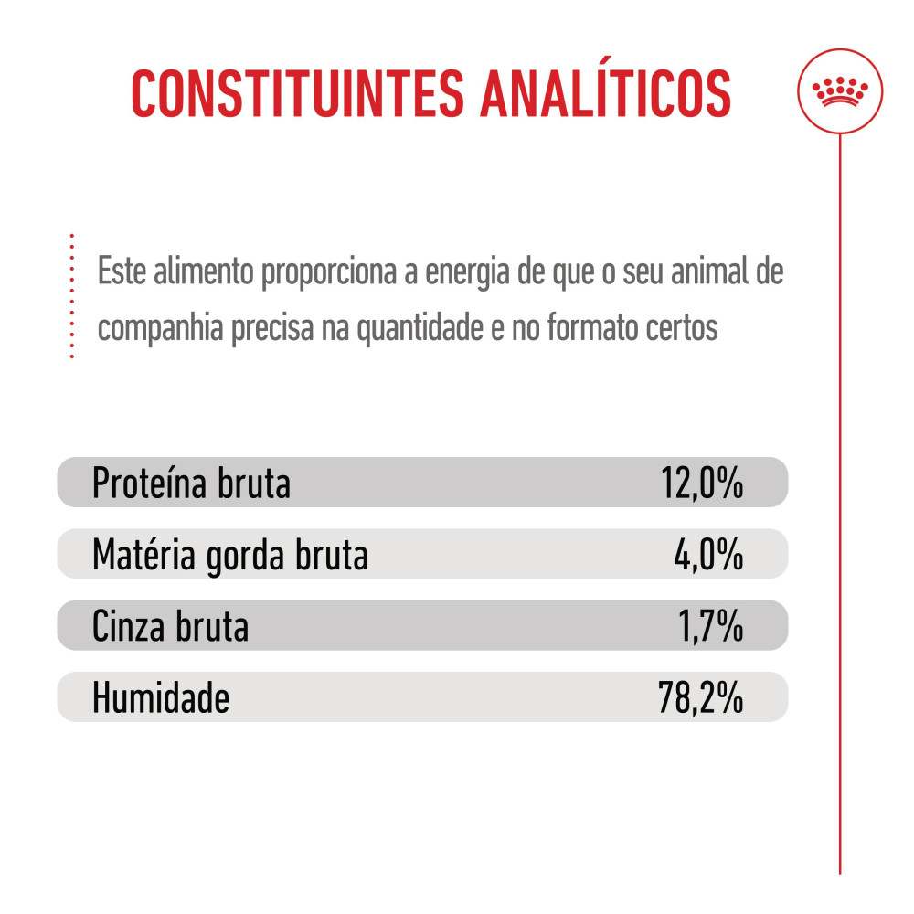 Proteína: 12% | Gordura: 4% | Fibra: 0,9% | Cinzas: 1,8% | Humidade: 78%.