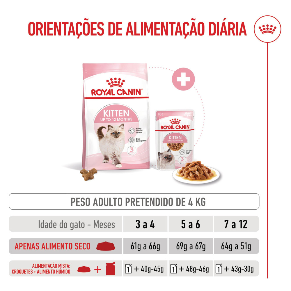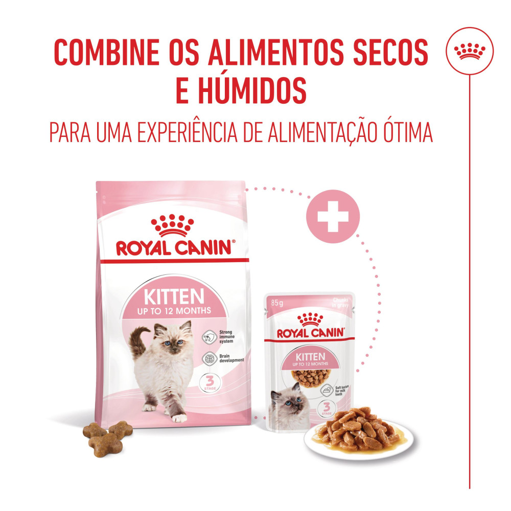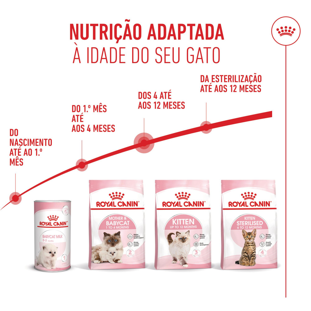 Quando o seu gatinho completar 12 meses, faça a transição para a gama Royal Canin Adult, disponível em alimento seco ou húmido (patê, pedaços em molho ou geleia).