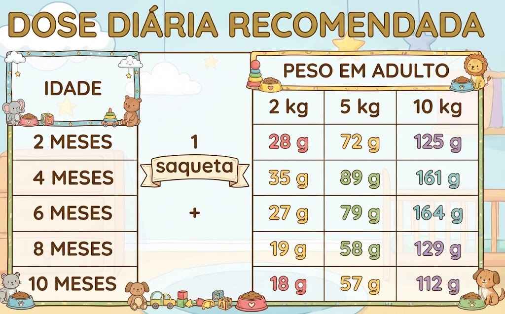 Nota: 1 saqueta + quantidade indicada de ração seca. Alimento seco recomendado: Royal Canin Puppy Mini.