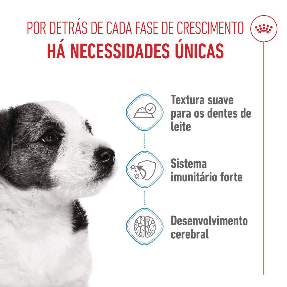 Pensado para cães com até 10 meses de idade e que, quando adultos, terão um peso máximo de 10 kg, Royal Canin Mini Puppy em molho foi desenvolvido para atender às necessidades nutricionais específicas dos cães de porte pequeno. Sua fórmula inclui um complexo exclusivo de antioxidantes, enriquecido com vitamina E, que auxilia no fortalecimento do sistema imunológico ainda em desenvolvimento.