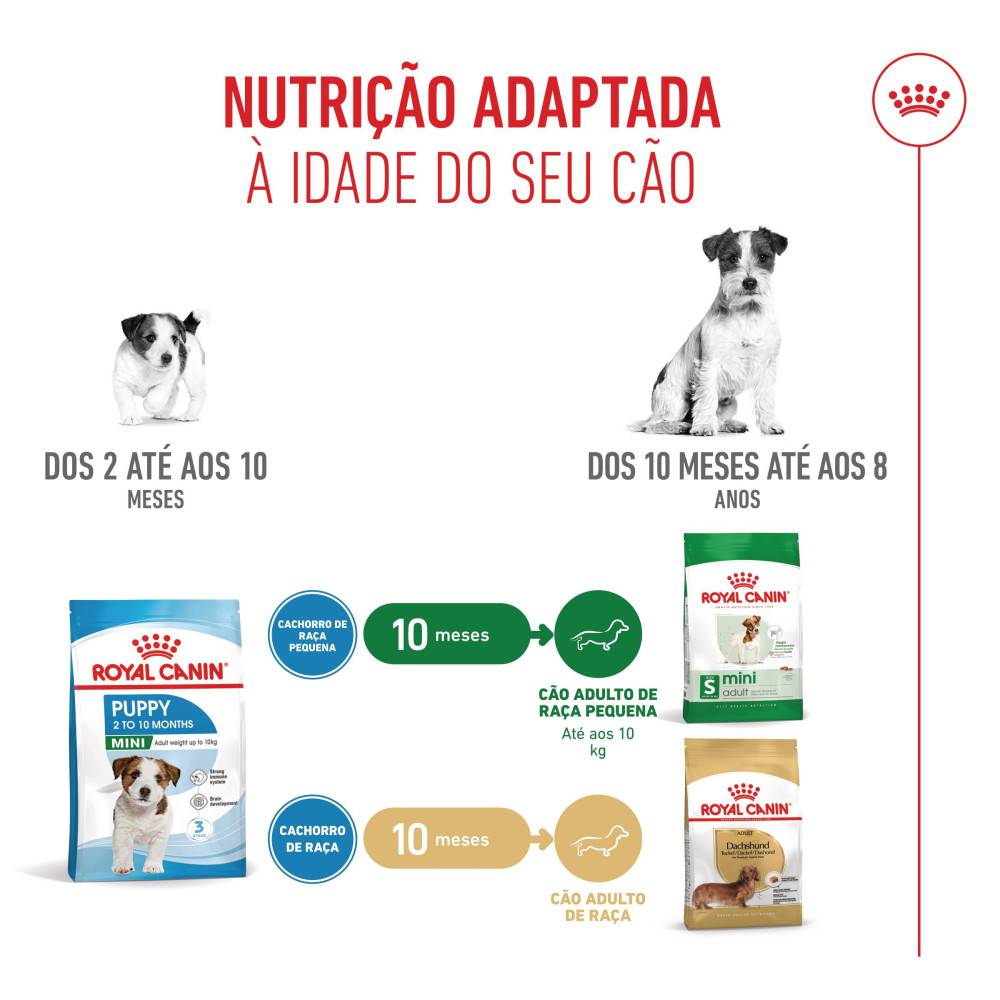 Quando o seu cachorro completar 10 meses, será necessário mudar para uma alimentação adequada à fase adulta. Nessa altura, pode optar pelo Royal Canin Mini Adult, disponível em versão seca ou húmida com pedaços em molho.